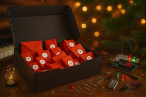 Hinter jedem Türchen verbergen sich neue Bauteile, neue Hardware-Projekte und neue Herausforderungen: Baue eigene Schaltungen auf, lerne deine eigenen Programme zu schreiben und entwickle deinen eigenen Code! Mit interaktiven Selbstlernkursen, Videos und Online-Live-Kursen. Es ist immer ein Erfolgserlebnis, wenn alles beginnt zu blinken und zu leuchten, genauso, wie du es programmiert hast!